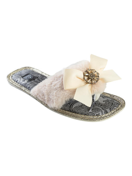 Тапочки-сланцы на прорезиненной подошве, выполнены из серого сатина с фантазийным темно-серым принтом, верхняя часть тапочка (ширина верхней части – 6 см) выполнена из бежевого искусственного меха и декорирована крупным атласным бантом бежевого цвета с роскошным украшением цвета шампань в виде цветка (диаметр украшения – 3 см). Окантовка тапочка выполнена из позолоченного материала в стиле винтаж. Упакованы в прозрачный полиэтиленовый пакет, внутри пакета находится пластмассовая вешалочка. Тапочки идеально подойдут для ношения дома, на даче, а также это прекрасная идея для подарка.