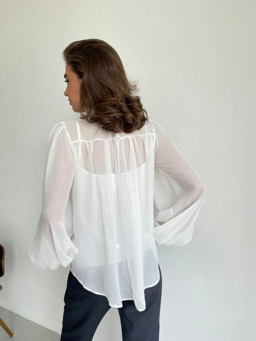 Универсальная блуза полу прилегающего силуэта в романтичном стиле. Длина блузы до линии бедра, Застежка по горловине на навесные петли и пуговицы. Воротник – стойка. Рукав свободного покроя длиной до запястья, со сборкой по окату рукава и низу рукава. Рукав на манжете застегивается на петли и пуговицы. Топ из креп-шифона, так как блуза из тонкой ткани, для обеспечения большего комфорта в носке. Декоративный бант, который можно завязать по линии горловины или использовать как пояс.