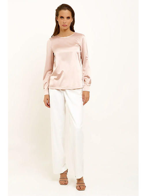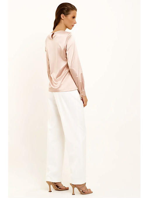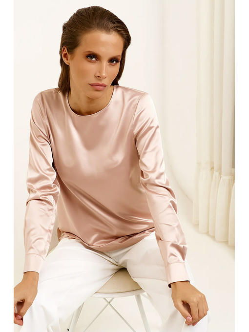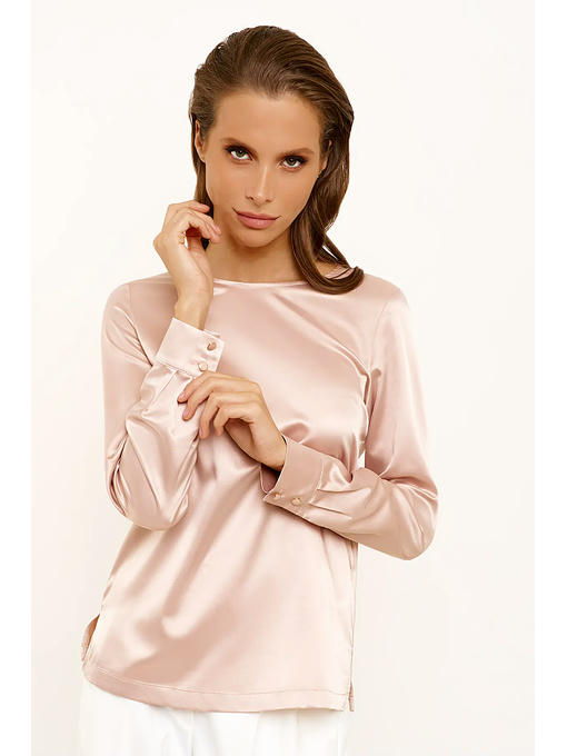 Лаконичная блузка из струящийся ткани с небольшим блеском. Блузка прямого силуэта с длинными рукавами с круглым вырезом горловины. Рукава с притачными по низу манжетами с декоративными пуговицами. Застежка по спинки на навесную петлю и пуговицу. По бокам разрезы. Отличный базовый вариант блузки в офис на каждый день