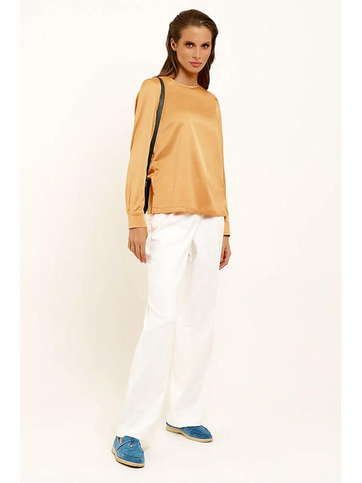 Лаконичная блузка из струящийся ткани с небольшим блеском. Блузка прямого силуэта с длинными рукавами с круглым вырезом горловины. Рукава с притачными по низу манжетами с декоративными пуговицами. Застежка по спинки на навесную петлю и пуговицу. По бокам разрезы. Отличный базовый вариант блузки в офис на каждый день