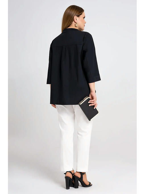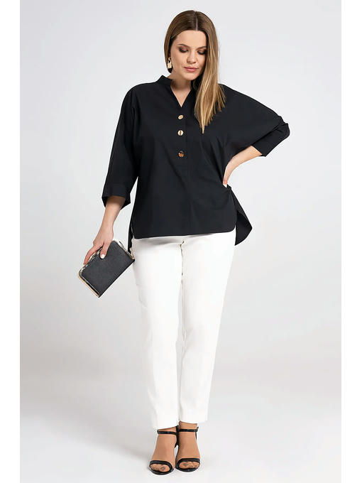 Оригинальная блузка из хлопка. Прямого силуэта, со спущенной линией плеча, горловина оформлена стойкой, центральная застежка до линии груди на три декоративные пуговицы, боковые швы книзу смещены на деталь переда, линия низа фигурной формы. Рукава 3/4, цельнокроеные, с отрезной манжетой. Спинка с кокеткой и складками от нее. Хороший вариант для работы и отдыха