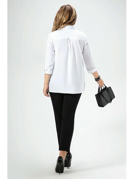 Лаконичная и строгая блузка из хлопковой ткани – отличный вариант для офиса. Блузка полуприлегающего силуэта слегка расширенная к низу, по бокам имеются небольшие разрезы. Блузка с центральной сквозной застежкой на потайные петли и пуговицы и одну декоративную пуговицу на стойке воротника. По переду имеются нагрудные выточки, по спинке имеется кокетка, от кокетки – небольшая сборка, что обеспечивает особый комфорт. Рукава длиной чуть ниже локтя, с отложными манжетами. На манжетах имеются декоративные петли и пуговицы. Такая блузка отлично сочетается с различными брюками, джинсами, сарафанами, создавая стильный современный образ