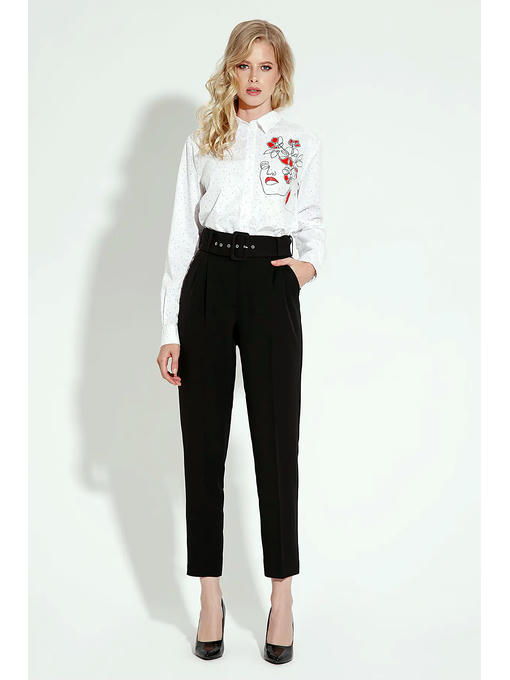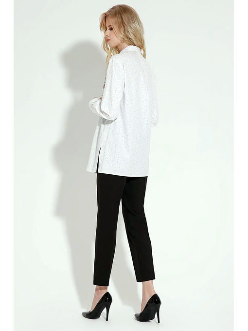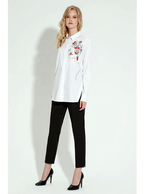 Блузка женская прямая По переду расположена печать в виде “девушки с цветами” Застежка по переду на петли-пуговицы Рукав втачной длинный По боковому расположен разрез, по спинке встречная складка для удобства носки