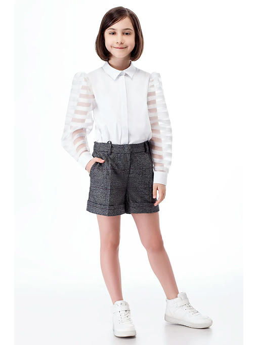 Нарядная блузка для девочки из хлопковой ткани с модными объёмными рукавами из органзы с рисунком в полоску. Блузка прямого силуэта, с центральной застежкой на потайные петли и пуговицы, с сорочечным воротником. Рукава длинные, объёмные на притачной по низу манжете. Очень стильный вариант для современных модниц, кто следит за последними трендами и хочет быть в центре внимания