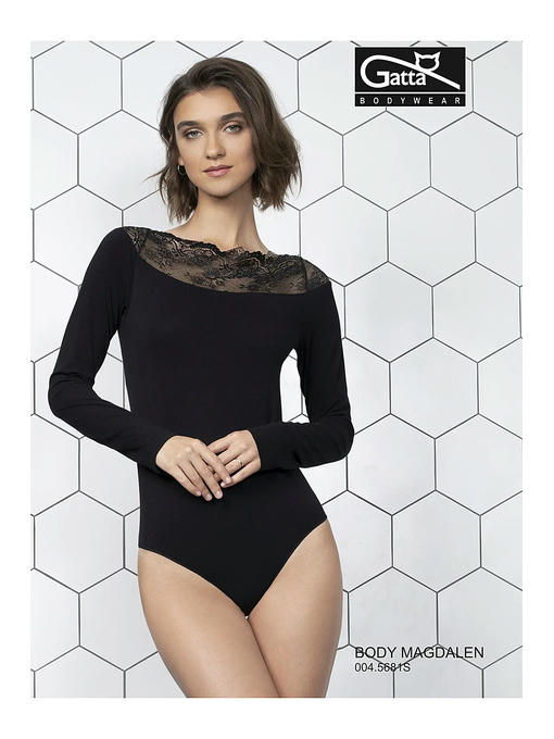 Элегантное боди из эластичной вискозы. У модели длинные рукава и вырез-лодочка, отстроченный кружевом с цветочным узором