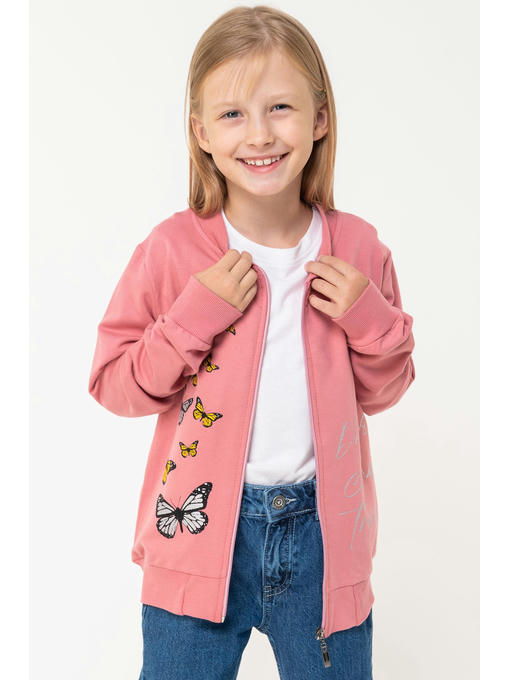 Хлопковый бомбер украшен рисунком бабочки. Отлично подойдет в качестве повседневной и школьной одежды.