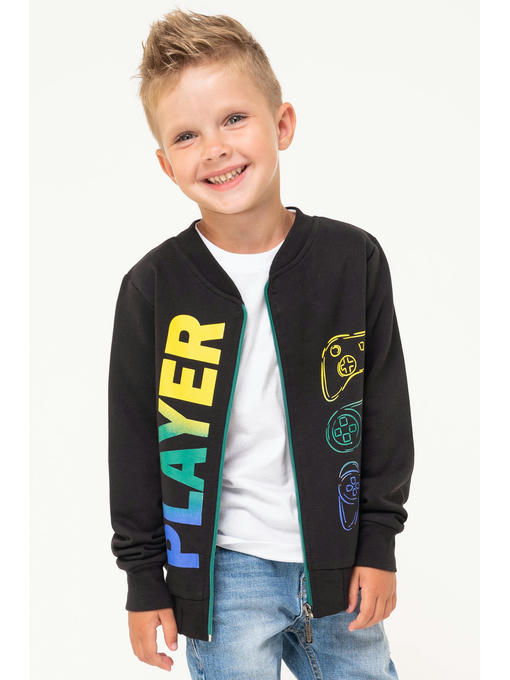 В линейке представлены трикотажные толстовки с принтами динозавр, рисунками и надписями на тему спорта, игр и гонок.