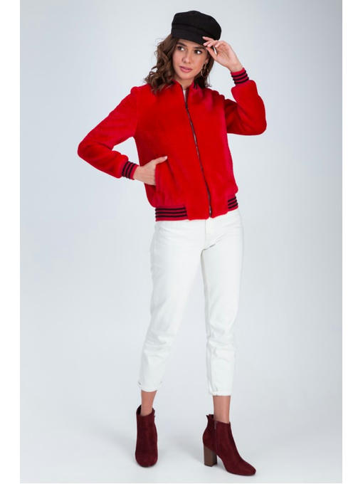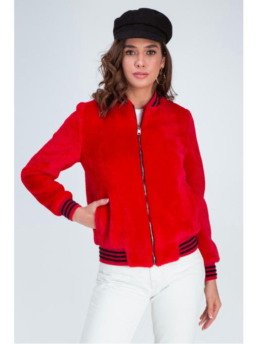 Бомбер из эко меха замечательный вариант для повседневной носки. Короткая куртка сделана из искусственного меха альпаки. Воротник-стойка и манжеты на рукав сделаны из довяза. Прорезные карманы с листочкой. Модель застегивается на центральную металлическую молнию.
