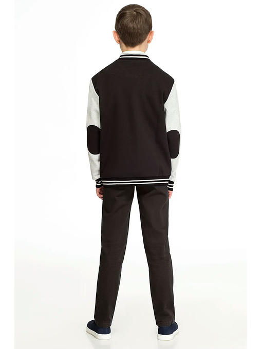 Бомбер для мальчика младшего школьного возраста из трикотажного полотна. Бомбер прямого силуэта, с центральной застежкой на кнопки, с воротником стойка, с карманами по переду. Низ рукавов и низ бомбера обработан притачными манжетами-довязами