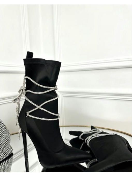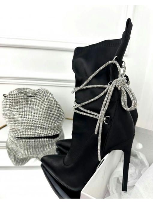 Ботильоны стрейчевые со сьемными камнями. Высота каблука: 11,5 см. Размерная сетка: 36-23,5; 37-24; 38-25; 39-25; 40-26; 41-27 см.