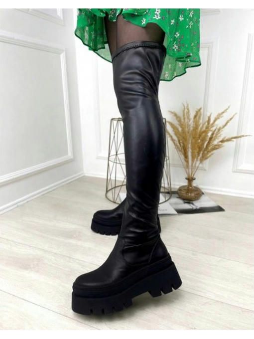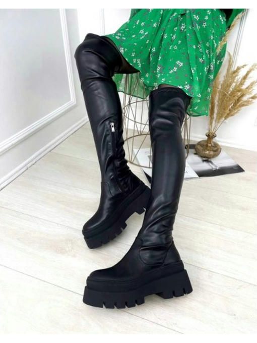 Ботфорты зимние на высокой тракторной подошве. Высота подошвы спереди 6 см., высота сзади 8 см. Высота от пятки 57 см. Размерная сетка: 36-23,5; 37-24; 38-24,5; 39-25,5; 40- 26 см.