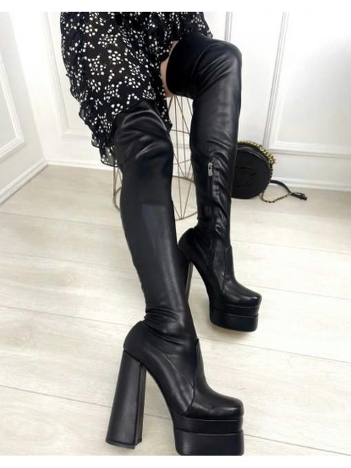 Ботфорты зимние на высоком каблуке с квадраным носком. Высота подошвы спереди: 5 см.; Высота каблука 14,5 см.; Высота от пятки 52 см.; Размерная сетка: 35-22,5; 37-24; 38-25; 39-25,5
