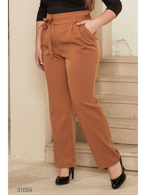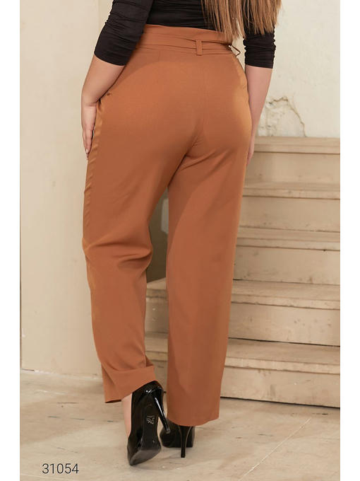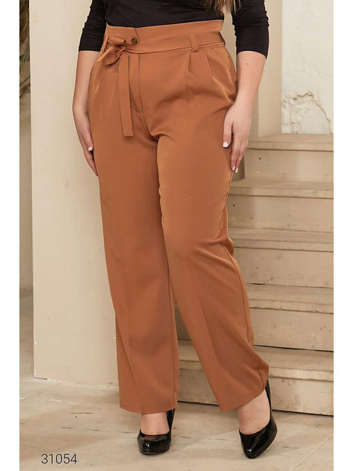 Брюки из качественной костюмной ткани. Завышенная талия, шлёвки, защипы, боковые карманы. Скрытая ширинка с застёжкой на молнию и пуговицу. В комплекте пояс из основной ткани.