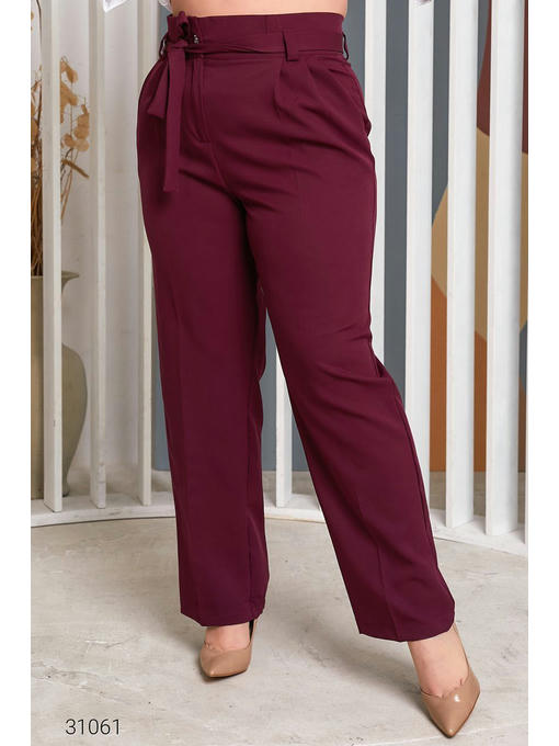 Брюки из качественной костюмной ткани. Завышенная талия, шлёвки, защипы, боковые карманы. Скрытая ширинка с застёжкой на молнию и пуговицу. В комплекте пояс из основной ткани.