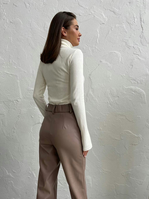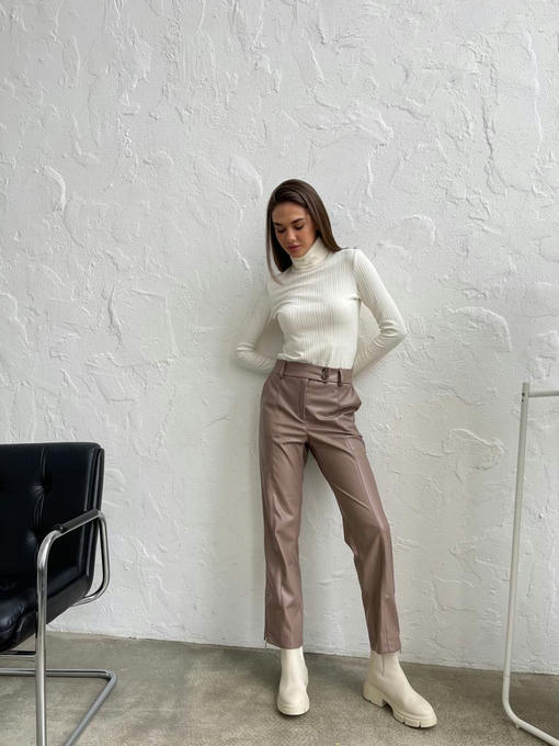 Брюки прямые, слегка зауженные к низу, в стиле кэжуал. Брюки длиной до щиколотки, по переднему полотнищу брюк шов, который заканчивается по низу молнией. Брюки с застежкой гульфик на молнии, пояс по краям фиксируется на пуговицах. На брюках карманы удобно расположены в подрезном бочке. Элегантная вещь в вашем гардеробе, прекрасно можно сочетать эти брюки как с классикой, так и со стилем спорт шик.