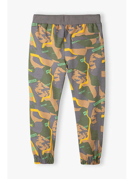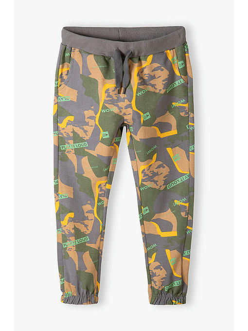 Спортивные брюки с камуфляжным принтом для мальчика выполнены из качественного хлопкового трикотажа. Спортивные штаны отлично пропускают воздух, а их крой не ограничивает свободу движений. Пояс с комфортной резинкой и шнурком, позволяющими легко отрегулировать ширину талии. Спереди удобные карманы, а края брючин собраны на резинку. Брюки отлично сочетаются с футболками, лонгсливами и толстовками