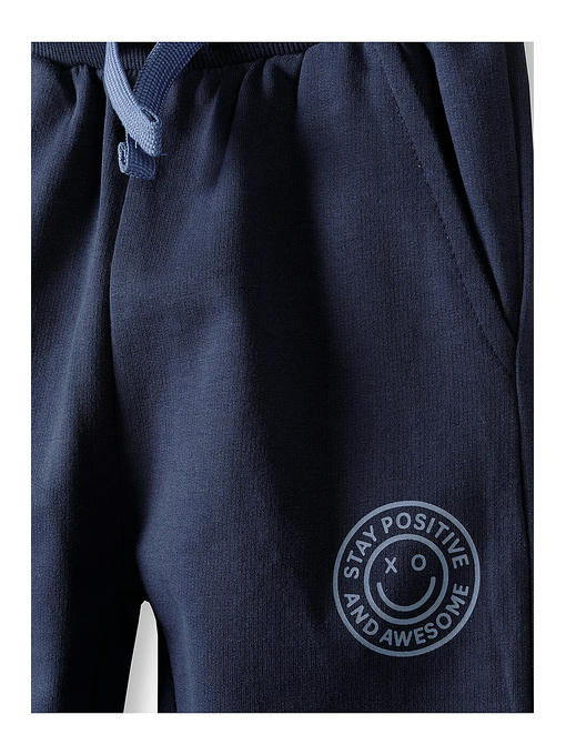 Спортивные брюки темно-синего цвета для мальчика выполнены из качественного хлопкового трикотажа, имеют зауженный крой. Спортивные штаны отлично пропускают воздух, а трикотажный материал не ограничивает свободу движений. Пояс с комфортной резинкой и шнурком, позволяющими легко отрегулировать ширину талии. Спереди удобные карманы, а края брючин с трикотажными манжетами. На одной из брючин небольшой принт. Брюки отлично сочетаются с футболками, лонгсливами и толстовками