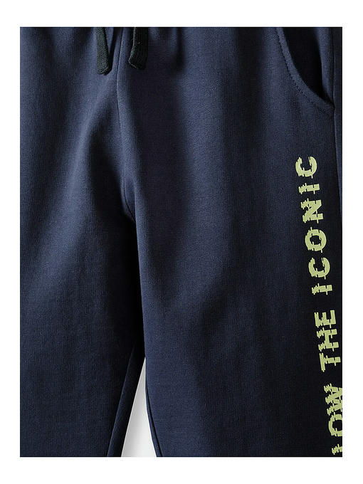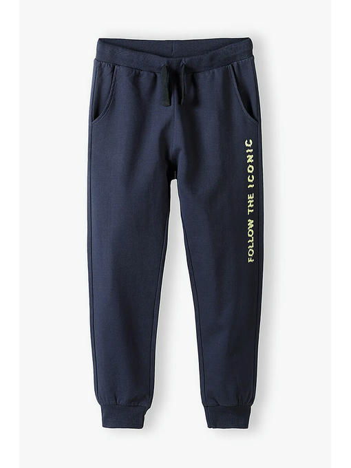Спортивные брюки темно-синего цвета для мальчика выполнены из качественного хлопкового трикотажа. Спортивные штаны отлично пропускают воздух, а их крой не ограничивает свободу движений. Пояс с комфортной резинкой и шнурком, позволяющими легко отрегулировать ширину талии. Спереди удобные карманы, а края брючин с мягкими трикотажными манжетами. На одной из брючин надпись. Брюки отлично сочетаются с футболками, лонгсливами и толстовками