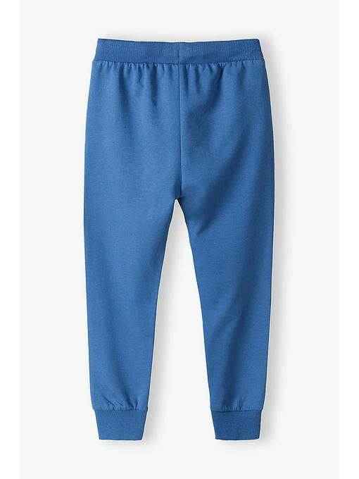 Спортивные брюки синего цвета для мальчика выполнены из качественного хлопкового трикотажа. Спортивные штаны отлично пропускают воздух, а их крой не ограничивает свободу движений. Пояс с комфортной резинкой и шнурком, позволяющими легко отрегулировать ширину талии. Спереди удобные карманы. Края брючин с мягкими трикотажными манжетами. На одной из брючин надпись «game in on». Брюки отлично сочетаются с футболками, лонгсливами и толстовками