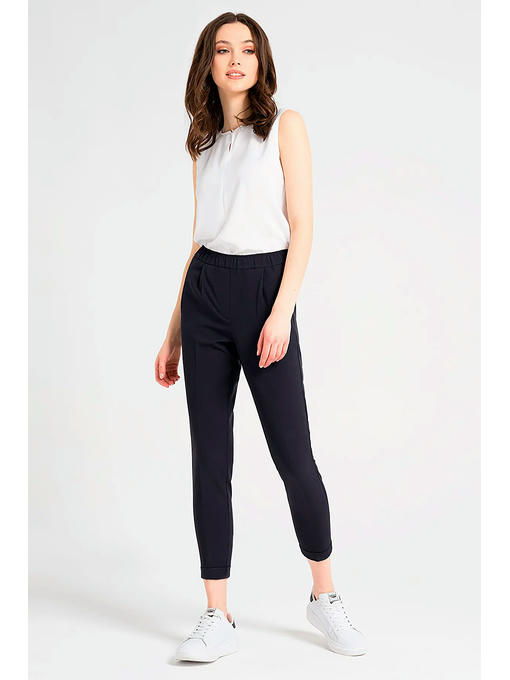 Стильные зауженные брюки длиной до щиколотки. По низу отложные манжеты. Брюки на резинке по талии. На передних и на задних частях брюк имеются карманы, по переду от пояса декоративные складочки. Отличный вариант брюк как на каждый день, так и для торжественных случаев
