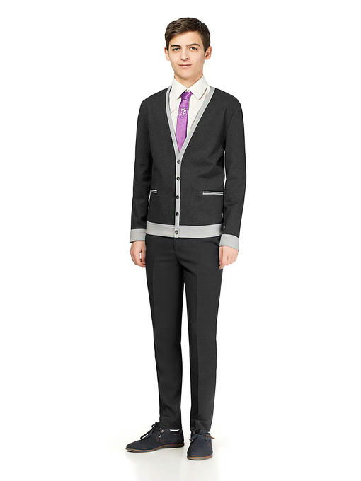Классические брюки для мальчика из поливискозной костюмной ткани. Брюки на талии, прямого силуэта, с притачным поясом. Брюки с застежкой на одну петлю и пуговицу на поясе, и тесьму-молнию по переду. По поясу расположены шлевки. На передних частях расположены боковые карманы. На задних частях брюк обработаны по одной вытачке на каждой половине. На задних частях брюк имеется прорезной карман в рамку. Передняя часть брюк на подкладки