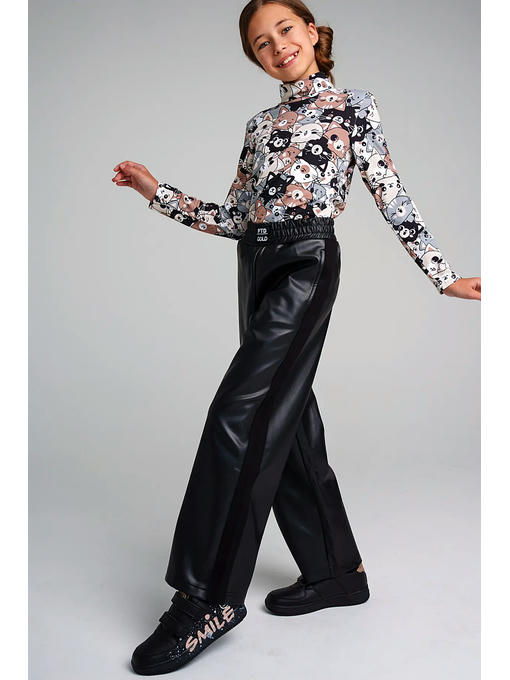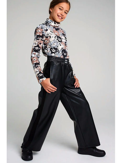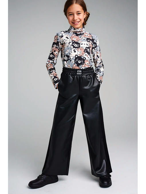 Брюки из искусственной кожи. Лампасы из трикотажа. Модель свободного кроя с широкими штанинами. Карманы в боковых швах. Широкий эластичный пояс