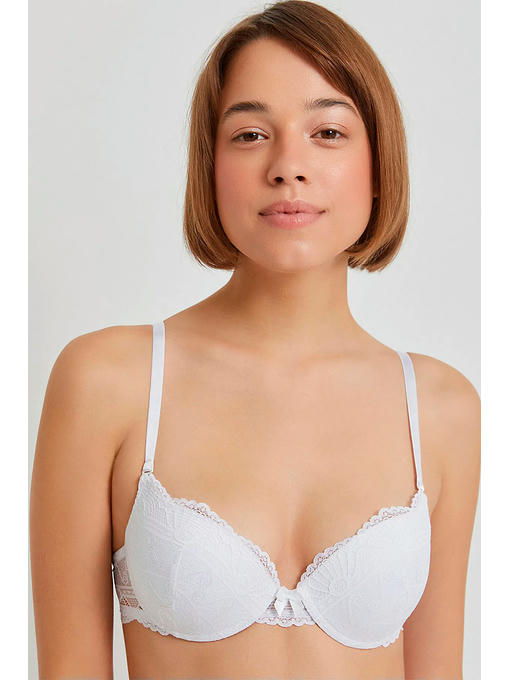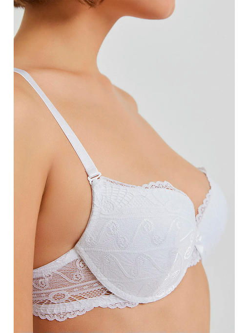 Базовый бюстгальтер классической формы, выполнен из микрофибры и кружева. Центральная деталь декорирована бантиком. Бретели регулируемые, съемные