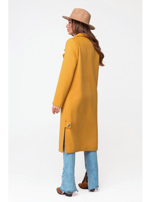 На лицевой стороне шерстяного пальто находится внешняя пуговица. Основная застежка – кнопки. Два прорезных кармана. Интересная деталь: разрезы по бокам, декорированные пуговицей. По бокам, на уровне талии, есть шлевки для пояса.