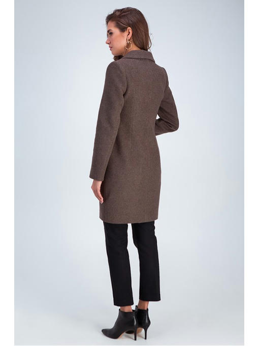 Под вырезом находится внешняя круглая пуговица. Под бортом изделия – застежка потайными пуговицами. Пальто средней длины интересно смотрится за счет тонкой линии карманов с листочкой. В качестве материала изготовления использована шерстяная ткань.