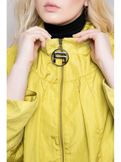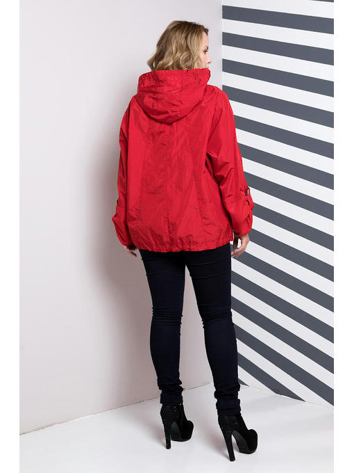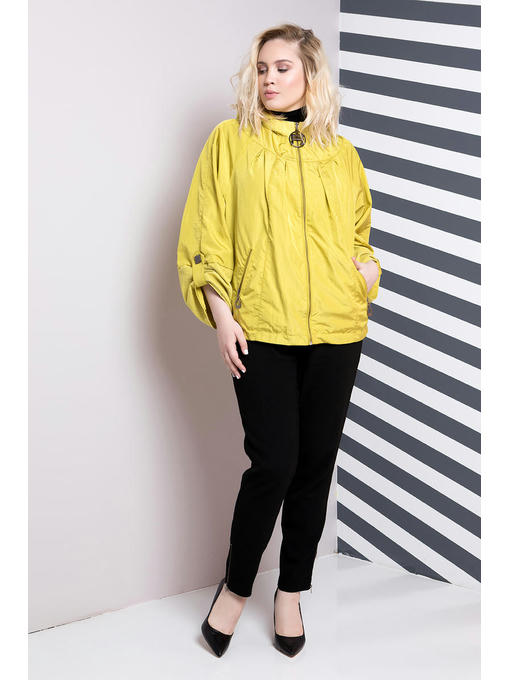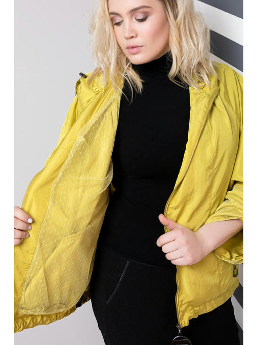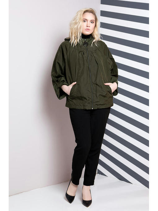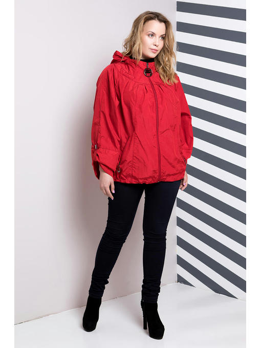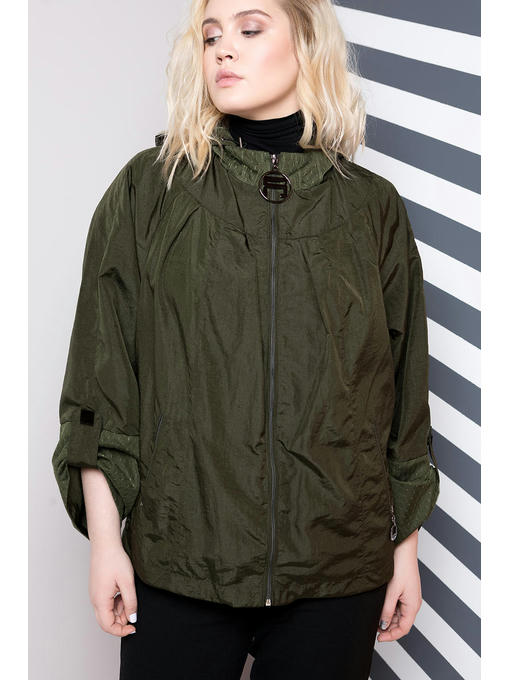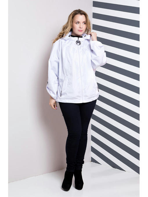 Легкая ветровка больших размеров. Силуэт – летучая мышь, по низу изделия есть утягивающая кулиса. Воротник стойка, воротник и низ рукава декорирован сеткой, которая так же и является подкладкой ветровки. Капюшон съемный. Молния центральная. Карман на молнии. На рукаве застегивается патта с кнопкой, рукав 7/8.