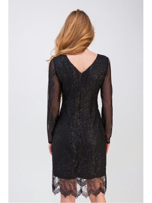 Вечернее платье с гипюром имеет прямой фасон. Основание платья – гипюр на подкладке. Рукава из стильной сетки в тон платья. Фигурный низ. Интерес вызывает глубокий вырез на спинке. Сзади находится неприметная молния.