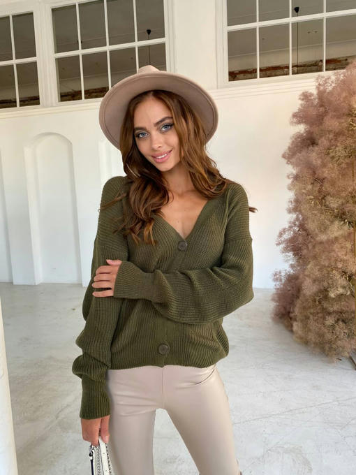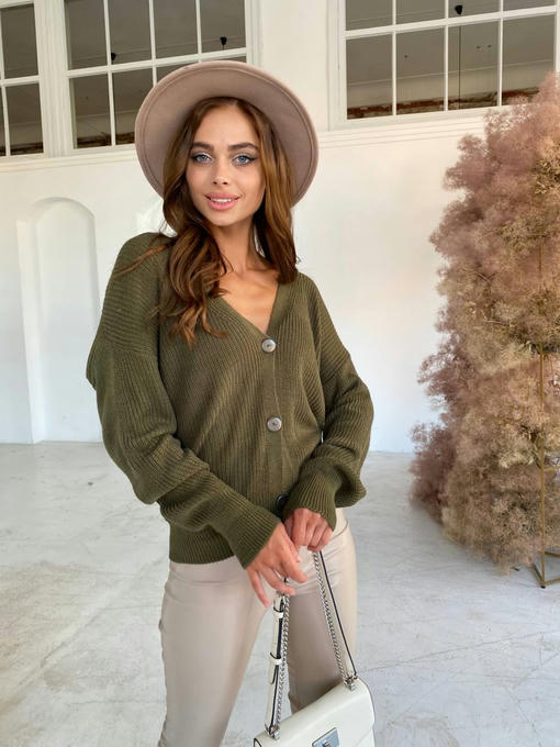 Стильный кардиган изготовлен из крупной вязки свободного силуэта в стиле оверсайз длиной ниже линии бедер. Горловина V-образная, по переду планка, которая застегивается на петли и пуговицы. По низу изделия и рукавов трикотажная резинка, для лучшего облегания. Данное изделие идеально дополнит ваш гардероб.