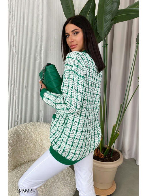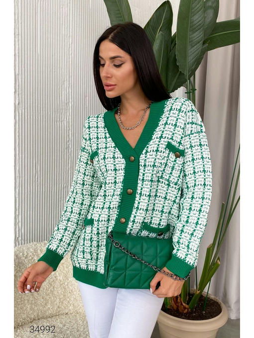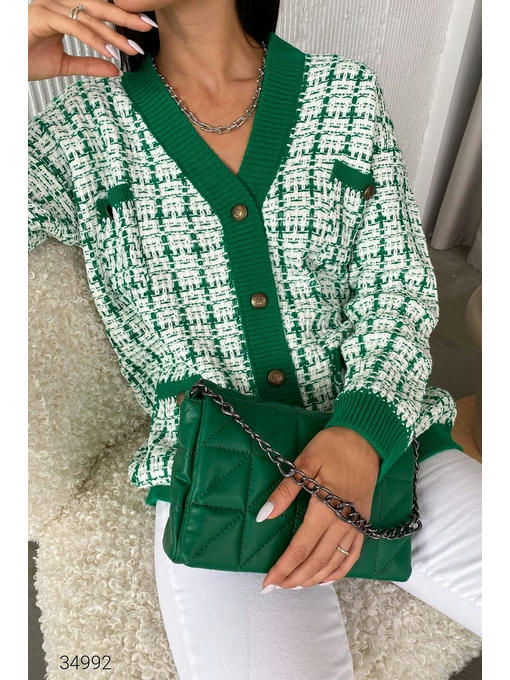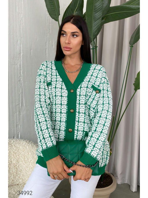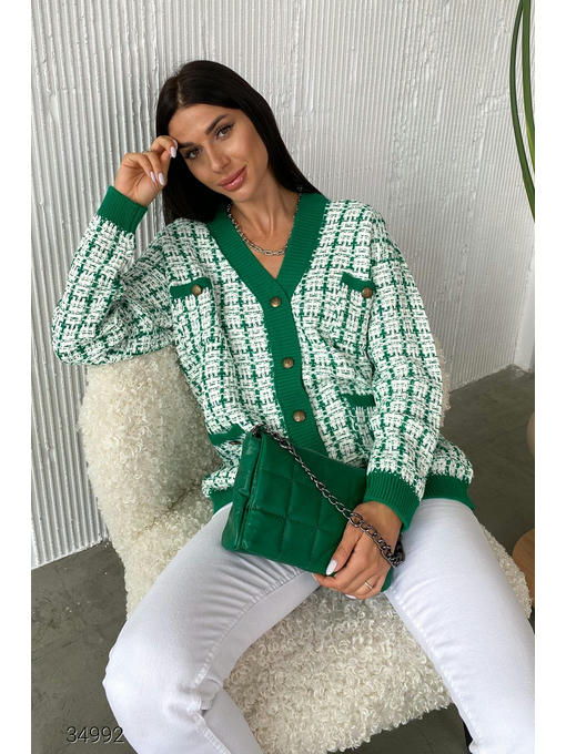 Кардиган в стиле оверсайз из качественной разноцветной вязки. V – образный вырез, контрастные края в рубчик, накладные карманы с декоративной пуговицей. Планка на золотистых пуговицах с фактурным рисунком. Размер универсальный, подходит на 42 – 48.