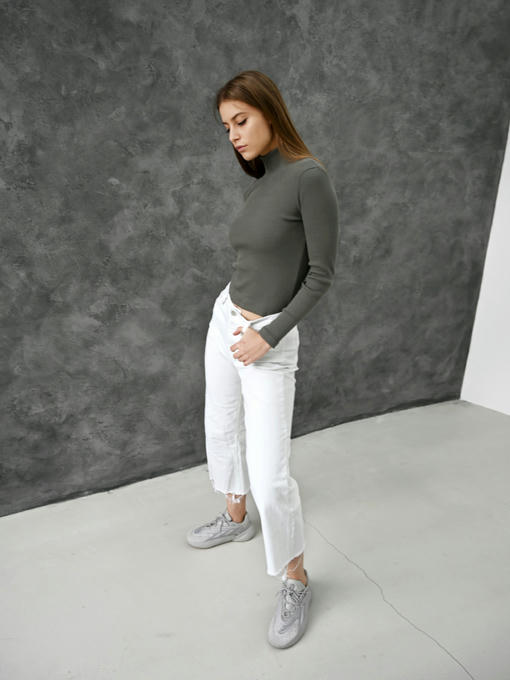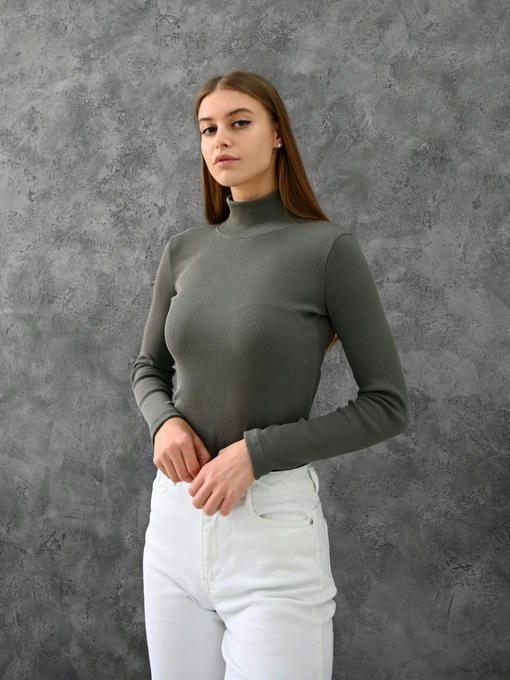 Базовый трикотажный гольф в мелкий рубчик с высокой горловиной. Классический крой, эластичная, приятная на ощупь ткань.