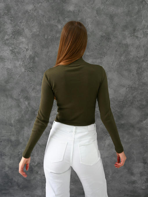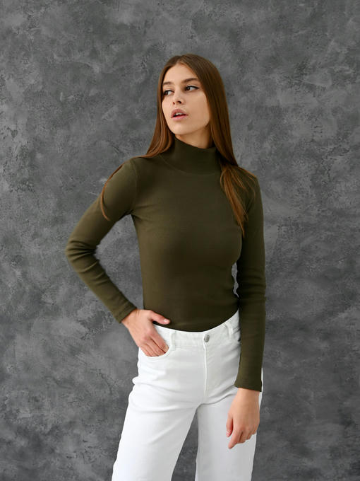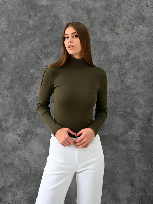 Базовый трикотажный гольф в мелкий рубчик с высокой горловиной. Классический крой, эластичная, приятная на ощупь ткань.