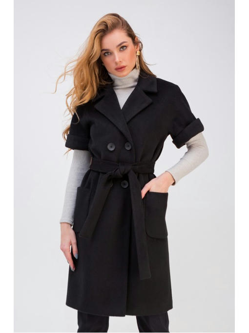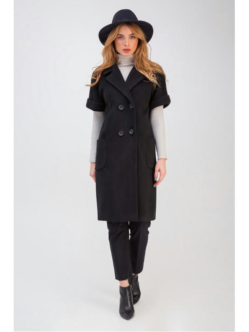 Двубортная жилетка с накладными карманами визульно напоминает пальто с короткими рукавами. Модель очень стильно выглядит в сочетании со свитерами, гольфами и кофточками.