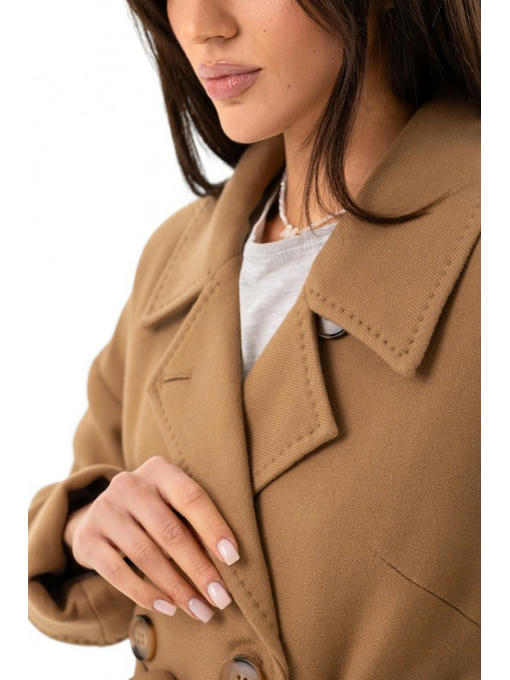 Двубортное демисезонное пальто комфортное и теплое. Однотонная шерстяная ткань с текстурой диагональ выглядит изысканно. Лоска добавляют пуговицы в 2 ряда на лицевой стороне изделия.