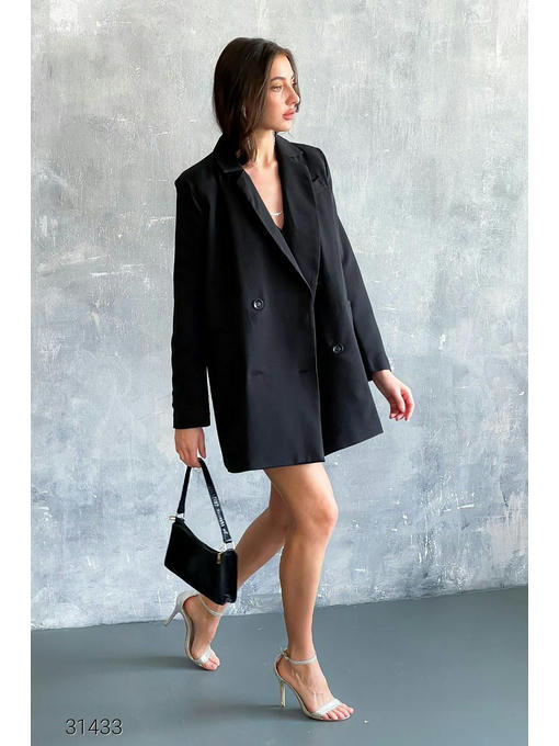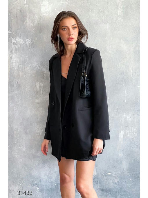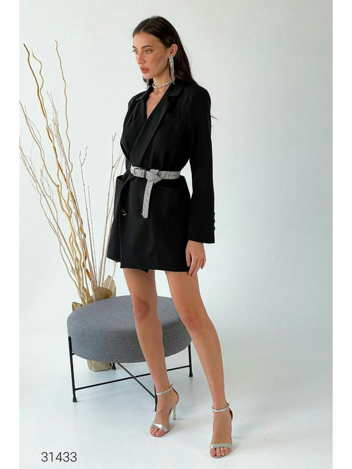 Удлиненный блейзер с двубортным дизайном. Лацканы с разрезами, подплечники, рукава с декоративной планкой. Нагрудный фальш – карман, прорезные боковые карманы, планка на пуговицах, есть подкладка. Ремень в комплект не входит.