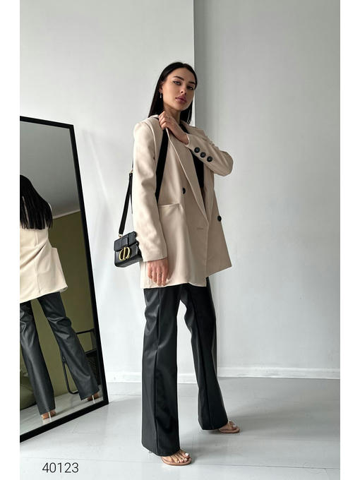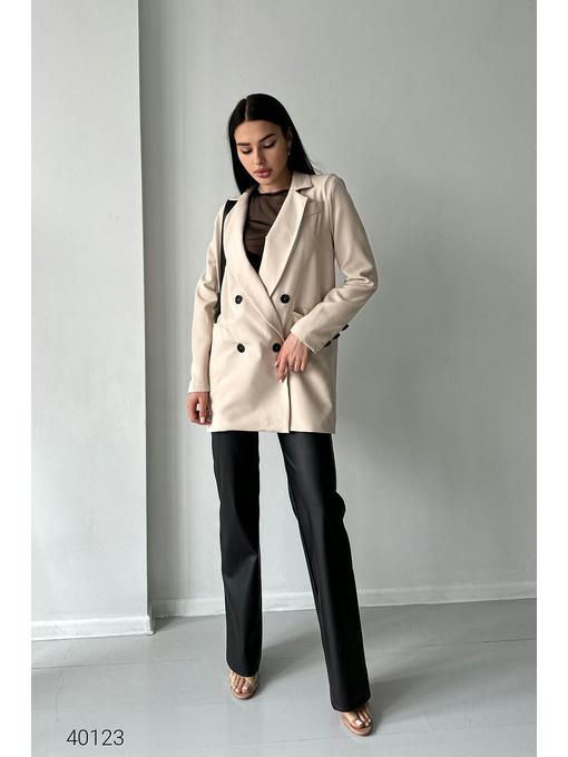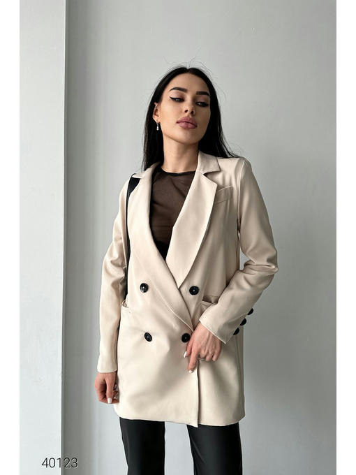 Удлиненный блейзер с двубортным дизайном. Лацканы с разрезами, подплечники, рукава с декоративной планкой. Нагрудный фальш – карман, прорезные боковые карманы, планка на пуговицах, есть подкладка. Ремень в комплект не входит.