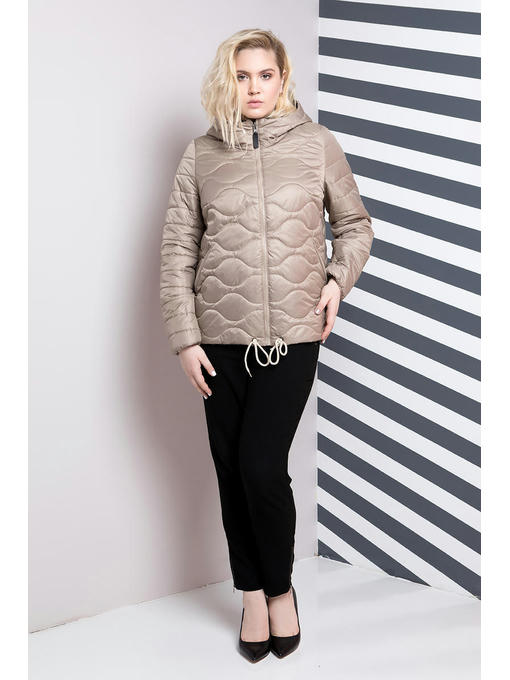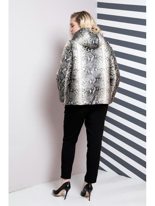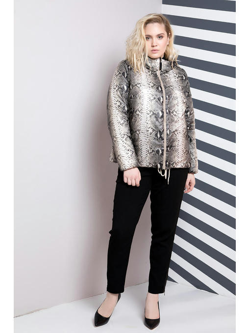 Стильная двусторонняя куртка со змеиным принтом немного расклешенная к низу. Куртка бежевого цвета стеганая волной, молния центральная идеально подходит в цвет ткани, карманы на молнии, бегунок молнии декорирован кожей. По низу куртки идет утягивающий шнурок. Капюшон вшитый, с утяжкой на резинке. Куртка утеплена на силикон «100»