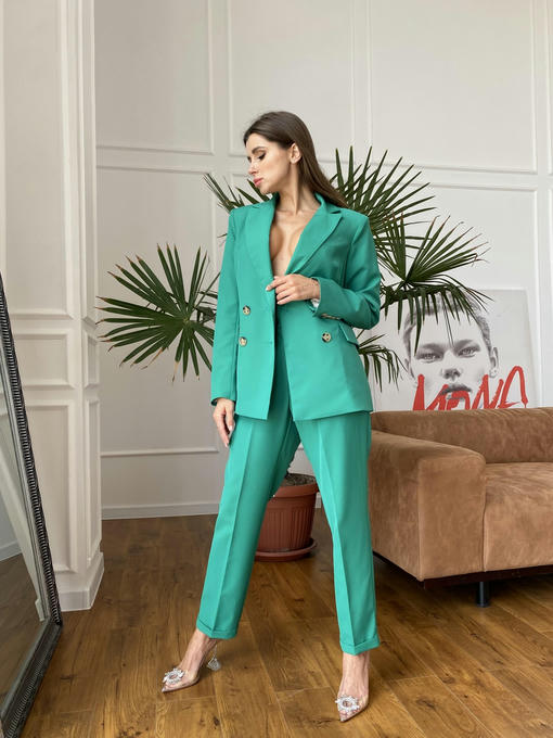 Костюм выполнен в оффисном стиле. Жакет полу-приталенного силуэта. Брюки классического кроя с заутюженной стрелкой и двумя складками, низ брюк заканчивается манжетом. Жакет длиной до бедра, брюки до щиколотки. Жакет с двубортной застежкой на петли и пуговицы. Брюки с застежкой гульфик на молнии, пояс по краям фиксируется крючками, по центру – петлей и пуговицей. Английский воротник придает элегантности строгому жакету. Двухшовный рукав, по низу локтевого шва заканчивается шлицей-обманкой и декорирован пуговицами. Карман прорезной с клапаном и листочкой удачно дополнаяет модель жакета, элегантно и функционально. На брюках карманы удобно расположены в подрезном бочке. Костюм прекрасно сочетает в себе удобство и элегантность. Не смотря на строгость делового костюма, его можно носить как под туфли на низком каблуке, собираясь на деловую встречу, так и под кеды на прогулке в городском парке. Дополнив образ туфлями на высоком каблуке, можно посетить торжественное мероприятие или отправиться на романтическое свидание.