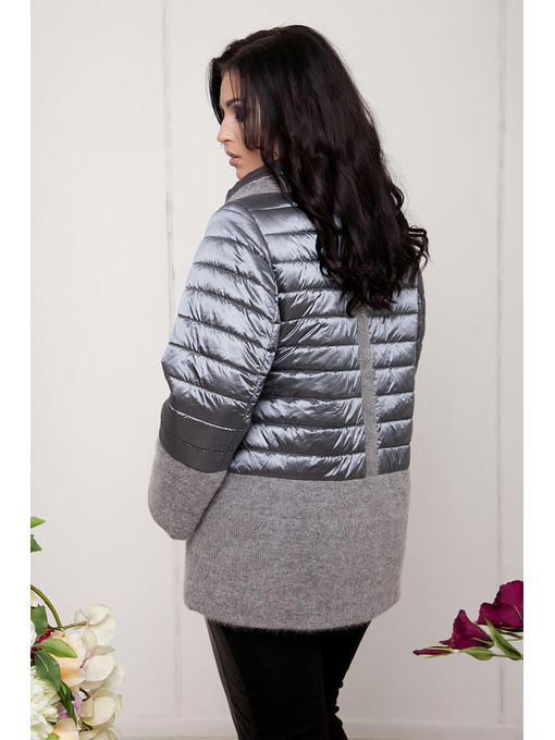 Стильная комбинированная куртка, материал плащевка Moncler с ангорой. Декоративные полоски из ангоры придают куртке оригинальности. Застежка – центральная молния, потайные кнопки темный никель. Карманы: в швах с клапанами, клапаны декорированны яркими пришывными сверкающими камнями нескольких видов. Силуэт изделия полуприталенный. Курточка утеплена на силикон “100”.