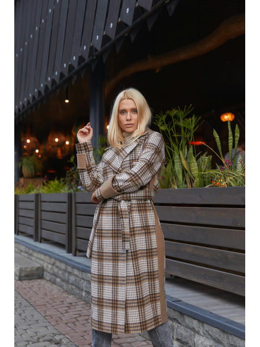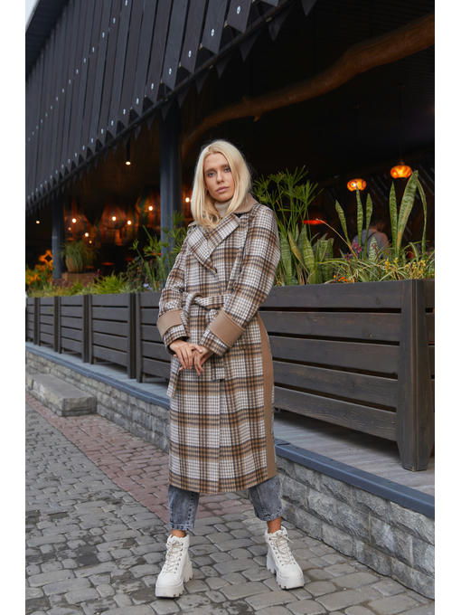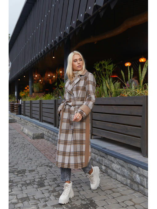 Демисезонное пальто из пальтовой из пальтовой клетки с отделкой из однотонного