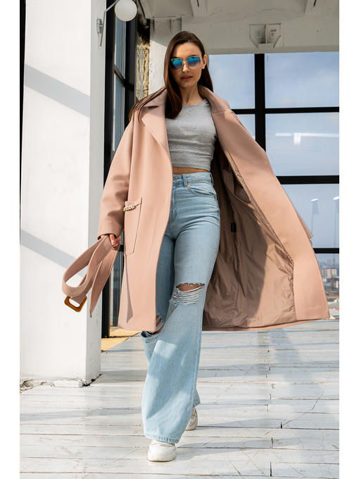 Демисезонное пальто из кашемира с элементами декора на кармане и поясе.