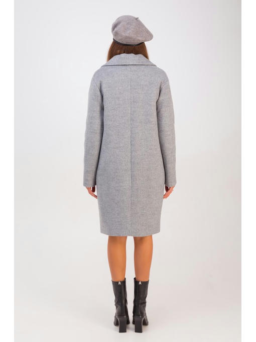 интересно выглядит за счет накладных карманов с закругленным низом, декорированных строчкой, имитирующей ручной стежок. Осеннее пальто закрывается потайными пуговицами. Под отложным воротником находится акцентная внешняя пуговица, выполняющая, в том числе, функцию украшения.