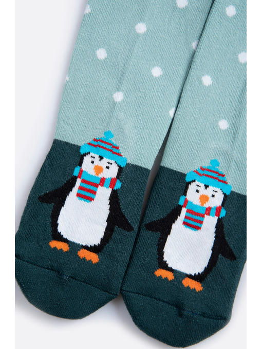 Утепленные детские колготки с махровой стопой выполнены из пряжи с высоким содержанием хлопка. Добавление синтетических волокон защищает от деформации и увеличивает срок службы детских колготок. Колготки выполнены в зеленой гамме и украшены вывязанным рисунком Пингвины.