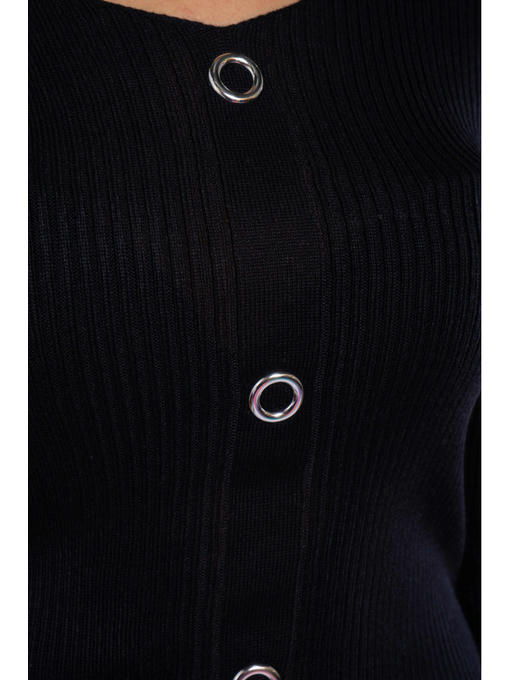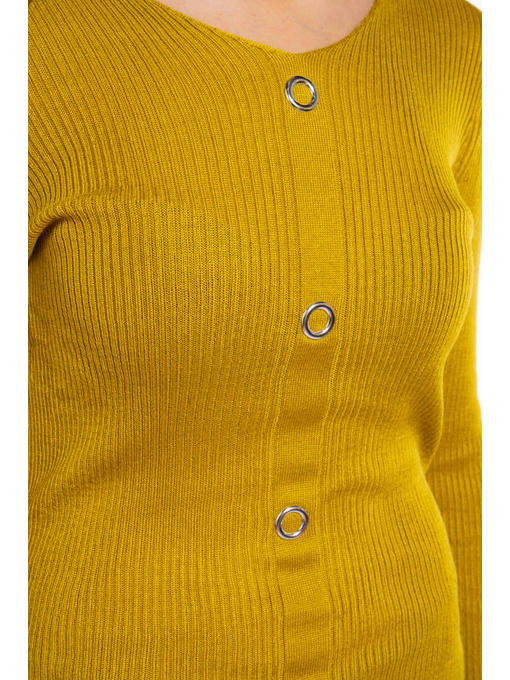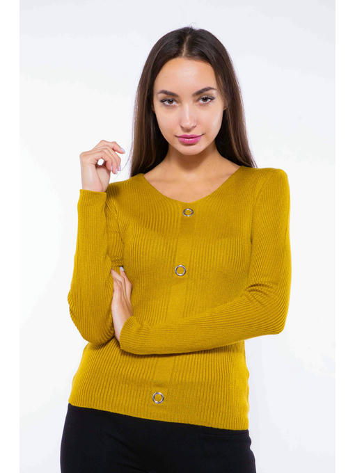 Легкий женский свитер с горловиной V-образной формы, выполнен из пряжи в состав которой входит натуральная шерсть в сочетании с акрилом, благодаря чему, изделие не требует сложного и специфического ухода, а также надолго сохранит привлекательный внешний вид. Декоративная отделка металлическими люверсами, имитирующими застежку по вязанной передней планке, удачно дополняет общий образ.