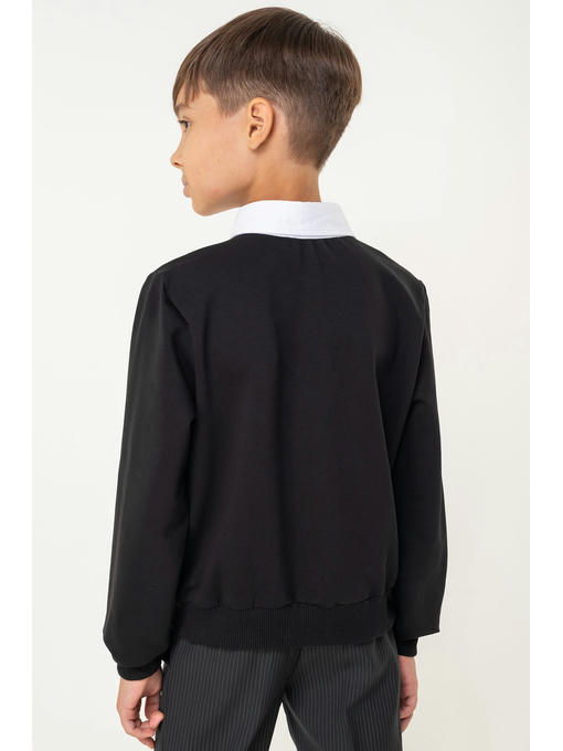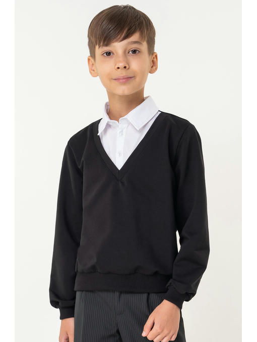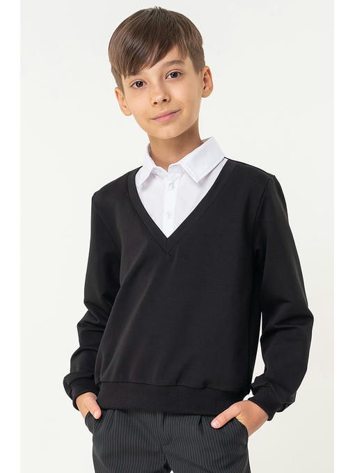 Классическая цветовая гамма отлично подходит для школы. Стильный трикотажный джемпер с имитацией рубашки в зоне ворота застегивается на пуговицы.