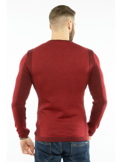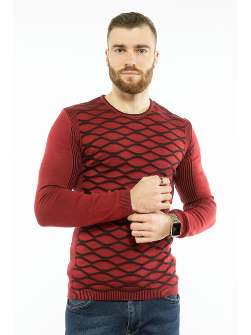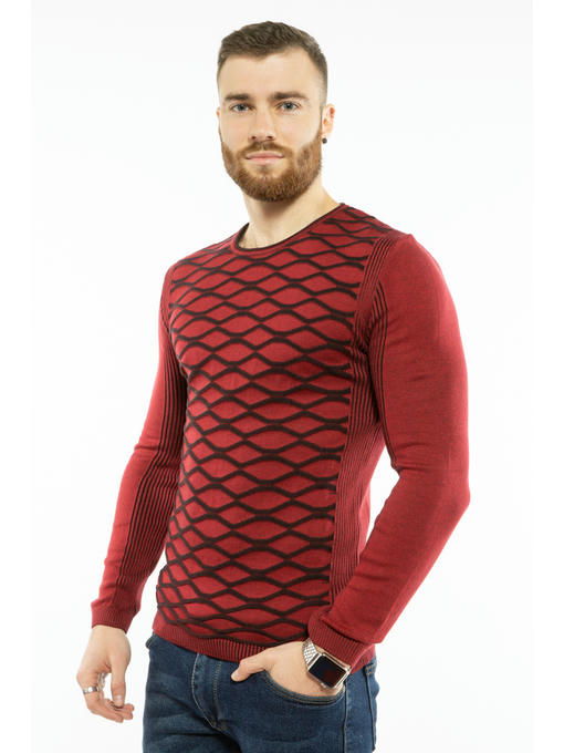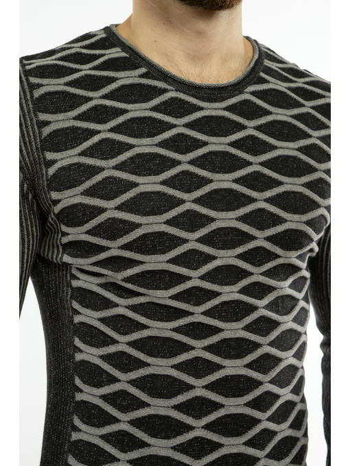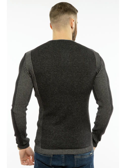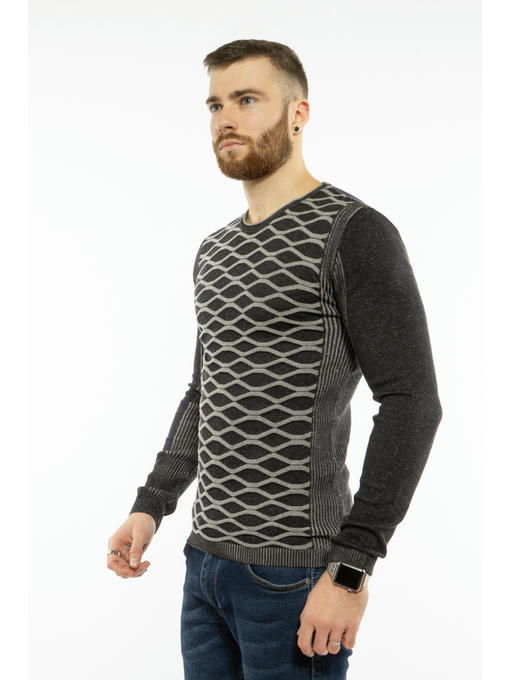 Стильный мужской свитер, выполнен из меланжевой пряжи, состоящей из натурального хлопка с добавлением акрила. Оригинальное дизайнерское оформление изделия, заключается в наличии контрастного узора по всей передней части, а также текстурной вставке по бокам свитера и внутренней части рукавов.