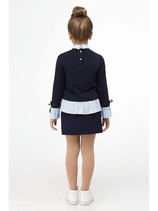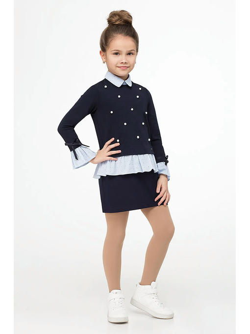 Стильный модный джемпер для девочки из хлопкового трикотажного полотна с отделкой из хлопковой ткани с рисунком. Джемпер прямого силуэта, с сорочечным воротником из хлопковой ткани с рисунком, с застежкой на петли и пуговицы на спинке. Рукава втачные длинные, по низу рукава притачен манжет из хлопковой ткани с рисунком. Над манжетами настрочена атласная лента, которая завязывается в декоративный бантик. По переду джемпер украшен бусинками. Джемпер отлично сочетается как с брюками, так и с юбками. Такой джемпер станет прекрасным выбором школьника